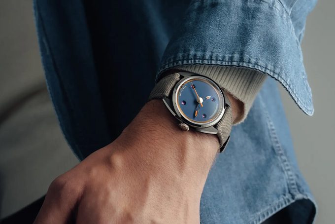 Wat dit horloge echt karakter geeft, is de afwerking. De kast is ‘micro-sandblasted’, wat zorgt voor een matte, bijna poederachtige textuur. Dit steekt prachtig af tegen de spiegelglad gepolijste randen van de lugs. Je kunt kiezen uit twee uitvoeringen: Avio Blue Velvet (een diepblauwe kleur) en Cocoa Brown Velvet (warm bruin). Beide varianten komen op een textiele band die de sportieve, doch stijlvolle look afmaakt.