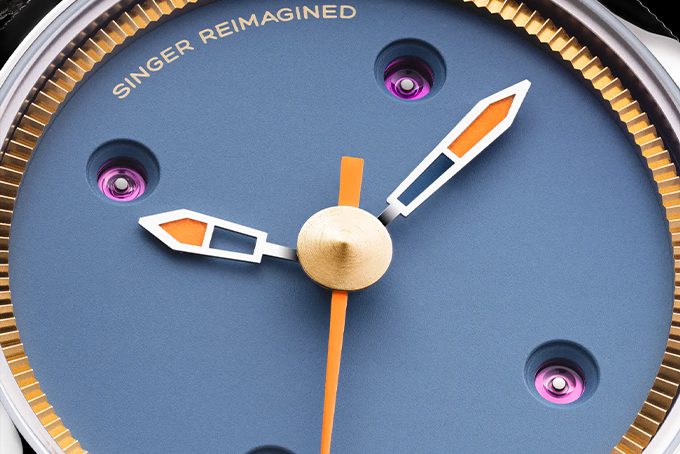 Singer heeft ook het design van de wijzerplaat onder de loep genomen. Het opvallende logo op 12 uur heeft plaatsgemaakt voor een subtielere tekst langs de rand. Hierdoor krijgen de goudkleurige details en de oranje accenten op de wijzers — een duidelijke knipoog naar hun automotive achtergrond — alle ruimte om te stralen. Het is een horloge voor mannen die niet hoeven te schreeuwen om op te vallen, maar die kwaliteit en vakmanschap op waarde schatten.